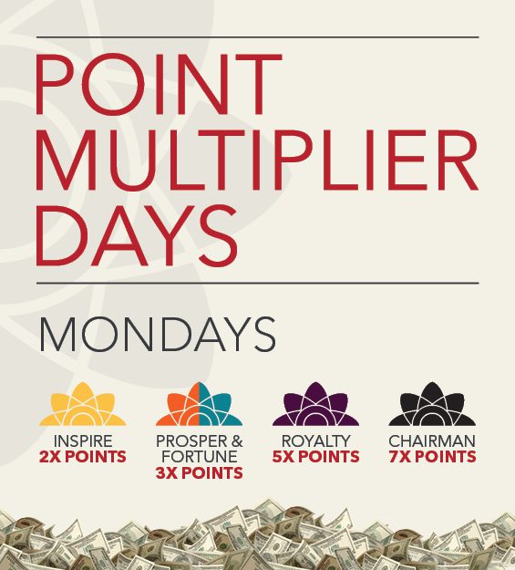 Activate your multiplier rewards at any Promotional Kiosk. All point multipliers will be added within 24 hours. Points earned from live poker are not eligible. Complete rules available at the Rewards Center.